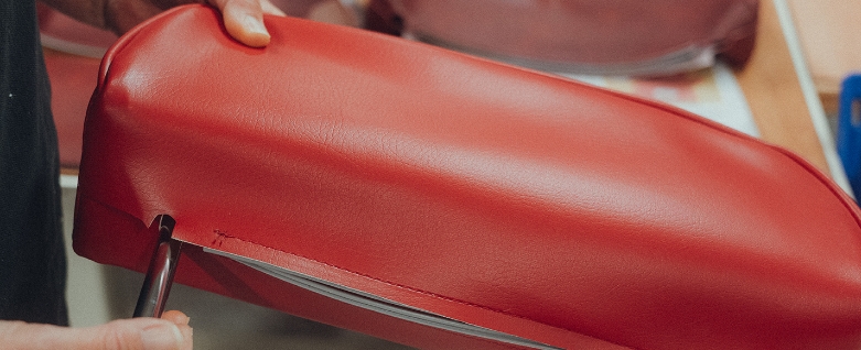 Börja med att montera bort ryggstödet genom att lossa skruvarna i fällbeslaget samt svankstödets ratt. Det är betydligt lättare att arbeta med stolen utanför bilen.2. Ta av klädseln från ryggstödet.